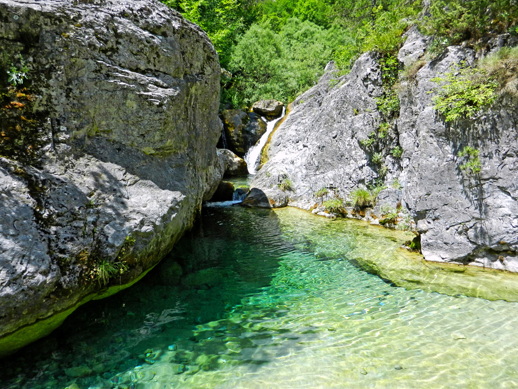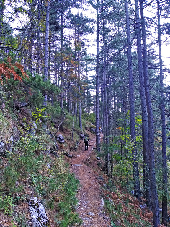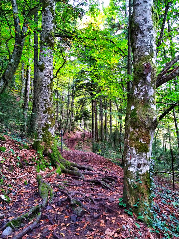 Διασχίζουμε το Οροπέδιο των Μουσών για να φτάσουμε στο ιστορικό Πέρασμα του Γιόσου 2.560μ. Κατηφορίζουμε για λίγο και περνάμε τον επιβλητικό Λαιμό και ανεβαίνουμε για πολύ λίγο ως την κορυφή Σκούρτα 2.476μ. Κατηφορίζουμε την ράχη προς τις Μάντρες και μπαίνουμε μέσα στο εντυπωσιακό δάσος με τα τεράστια ρόμπολα. Τραβερσάρουμε τις πλαγιές και φτάνουμε στο καταφύγιο Πετρόστρουγκα 1.930μ. Συνεχίζουμε κατηφορικά διασχίζοντας τεράστια δάση μαύρης πεύκης και οξυάς. Περνάμε τη ράχη της Μπάρμπας και καταλήγουμε στη θέση Διασταύρωση.