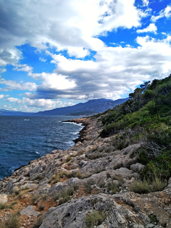 Με όσους επιθυμούν να κάνουν και τη μεγαλύτερη κυκλική διαδρομή θα συνεχίσουμε, αφού πάρουμε άλλο μονοπάτι το οποίο βρίσκεται μέσα σε πυκνό δάσος πεύκων και θα μας βγάλει δίπλα από παρθένες παραλίες. Εναλλαγή δάσους και παραλιών, στις οποίες μπορούμε να επιλέξουμε να κάνουμε μπάνιο. Κατόπιν θα συνεχίσουμε ανηφορικά με ήπια κλίση προς τα χωράφια με το θυμάρι. Ιδιαίτερο τοπίο αυτό το άνοιγμα στο δάσος με θέα τόσο προς το βουνό όσο και προς τη θάλασσα. Στη συνέχεια θα ακολουθήσουμε δασικό δρόμο, ο οποίος θα μας οδηγήσει σιγά σιγά κάτω από τα φυλλώματα των δέντρων στο χωριό Στραβά, ολοκληρώνοντας έτσι τη διαδρομή μας.