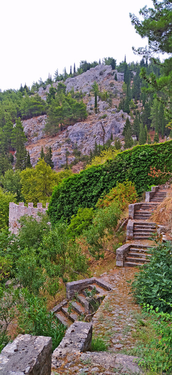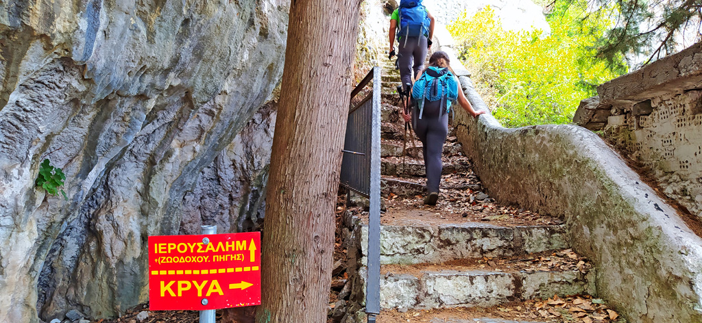 Ξεκινάμε τη πεζοπορίας μας, από το Δημοτικό Στάδιο της πόλης. Είσοδος σε Πευκοδάσος και αρχικά ακολουθούμε δασικό δρόμο και κατόπιν μονοπάτι, όπου μετά από λίγο θα δούμε τις βάσεις, όπου υπήρχαν 3 πολυβολεία. Συνέχεια ανάβασης έως το ξύλινο γεφυράκι, που βρίσκεται πιο χαμηλά από το εκκλησάκι του Ευαγγελιστή Λουκά. Σε αυτό θα κάνουμε στάση για ξεκούραση στον εξωτερικό διαμορφωμένο χώρο και επιστροφή στο γεφυράκι. Κατάβαση έως ένα μπαλκόνι με ωραία θέα στη πόλη της Λιβαδειάς. Νότιο δυτικά μας, διακρίνουμε τους Κολιέδες 1.486μ. Επίσης έχουμε καλή θέαση στο εκκλησάκι της Αγίας Ιερουσαλήμ, το οποίο βρίσκεται “σκαρφαλωμένο” ανάμεσα στα βράχια πάνω από το φαράγγι της Κρύας. Προσέγγιση της Αγίας Ιερουσαλήμ. Απέναντι μας στο λόφο βλέπουμε το Βυζαντινό εκκλησάκι της Αγίας Σοφίας το οποίο βρίσκεται μέσα στο Μεσαιωνικό Κάστρο της Λιβαδειάς. Αναγνωρίζουμε επίσης, το Αμφιθέατρο της Κρύας από ψηλά. Συνέχεια της κατάβασης έως το φαράγγι και από εκεί στο ποταμό Έρκυνα και τις ξακουστές πηγές της Κρύας. Κοντά στο σημείο αυτό υπήρχε το μαντείο Τροφωνίου, ένα από τα σημαντικότερα μαντεία της ελληνικής αρχαιότητας, αυτό του ήρωα, μάντη και θεού Τροφωνίου. Ο Τροφώνιος, ενίοτε ταυτιζόμενος με το Δία και γνωστός και ως Δίας Τροφώνιος, ήταν αρχαία τοπική θεότητα.