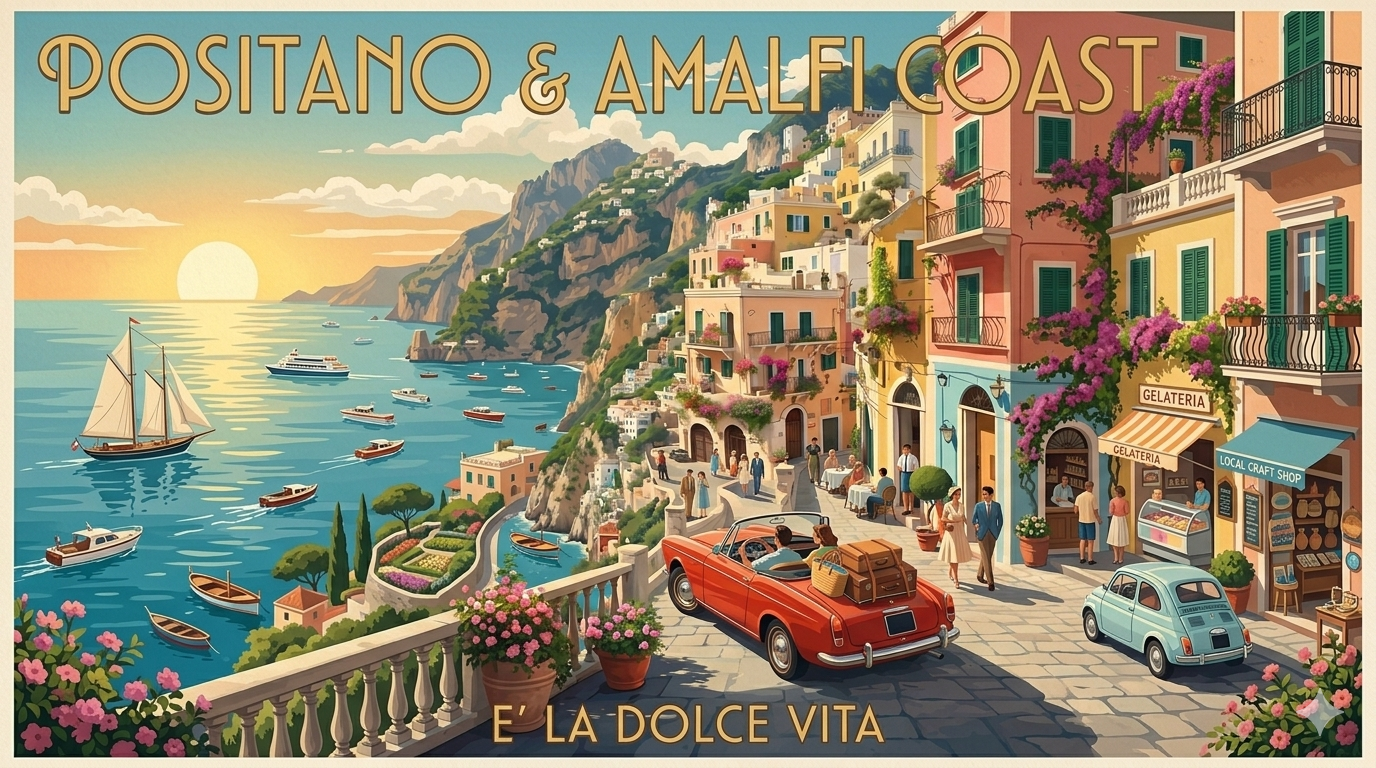 Το Ποζιτάνο είναι ίσως η πιο αναγνωρίσιμη εικόνα της Ακτής Αμάλφι, ένα χωριό που μοιάζει να κυλάει από τον βράχο προς τη θάλασσα σε διαδοχικά επίπεδα χρωμάτων και φωτός. Τα σπίτια του, βαμμένα σε απαλές αποχρώσεις, δημιουργούν ένα μοναδικό σκηνικό, ενώ τα στενά σοκάκια, γεμάτα σκαλιά, οδηγούν σε μικρές πλατείες, καταστήματα και σημεία θέας που αποκαλύπτουν συνεχώς νέες εικόνες. Το Ποζιτάνο δεν χρειάζεται ιδιαίτερα αξιοθέατα για να εντυπωσιάσει· η ίδια η αρχιτεκτονική του, η σχέση του με τη θάλασσα και η αίσθηση χαλαρής πολυτέλειας που το χαρακτηρίζει το καθιστούν έναν προορισμό που βιώνεται περισσότερο παρά περιγράφεται.
