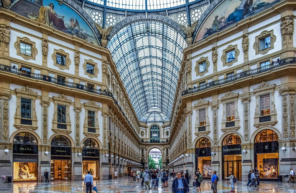 Η ιστορική στοά του 19ου αιώνα με τον εντυπωσιακό γυάλινο θόλο και τα μωσαϊκά δάπεδα αποτελεί ένα από τα πιο κομψά αρχιτεκτονικά σύνολα της Ιταλίας. Στο εσωτερικό της, boutique υψηλής ραπτικής και ιστορικά καφέ δημιουργούν ατμόσφαιρα Belle Époque.